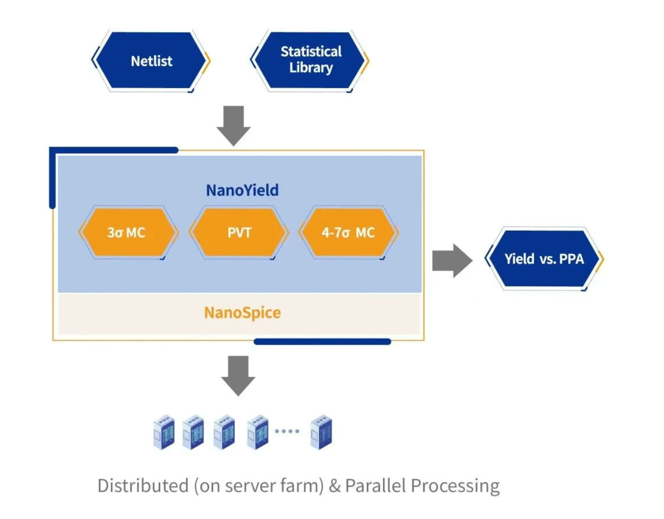 随着芯片工艺向先进节点持续演进,工艺随机扰动显著压缩设计裕量,高端芯片的性能提升与良率优化面临严峻挑战。良率导向设计(DFY)作为芯片流片前的关键环节,通过先进统计仿真工具实现良率的精准分析与优化,直接决定芯片产品的可靠性、量产能力及市场竞争力。现代高端芯片(如CPU、GPU、AI芯片及各类存储芯片)包含数以亿计的重复单元,先进工艺下,晶体管或寄生器件的工艺随机扰动易导致个别单元失效,单元失效率需精准覆盖6 sigma及更高维度;而传统仿真手段往往需要数月时间,难以满足研发效率需求。